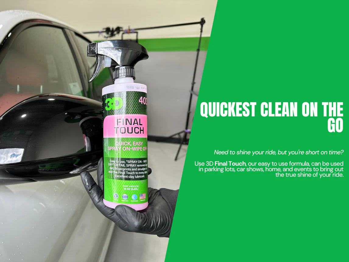 הוא ספריי דיטיילר מהיר המועדף על ידי מקצועני דיטיילינג וחובבי רכב כאחד. מסיר בקלות אבק קל, כתמים וטביעות אצבעות, ומשאיר גימור מבריק וחלק – ללא פסים וללא שאריות. הנוסחה בעלת החלקות הגבוהה הופכת אותו גם לחומר סיכה מצוין לשימוש עם פלסטלינה. מושלם לתחזוקה לאחר שטיפה, לניקוי מהיר ולשמירה על מראה רענן. ניחוח הדובדבן הנעים מוסיף חוויית שימוש מהנה. מיוצר בארה"ב.