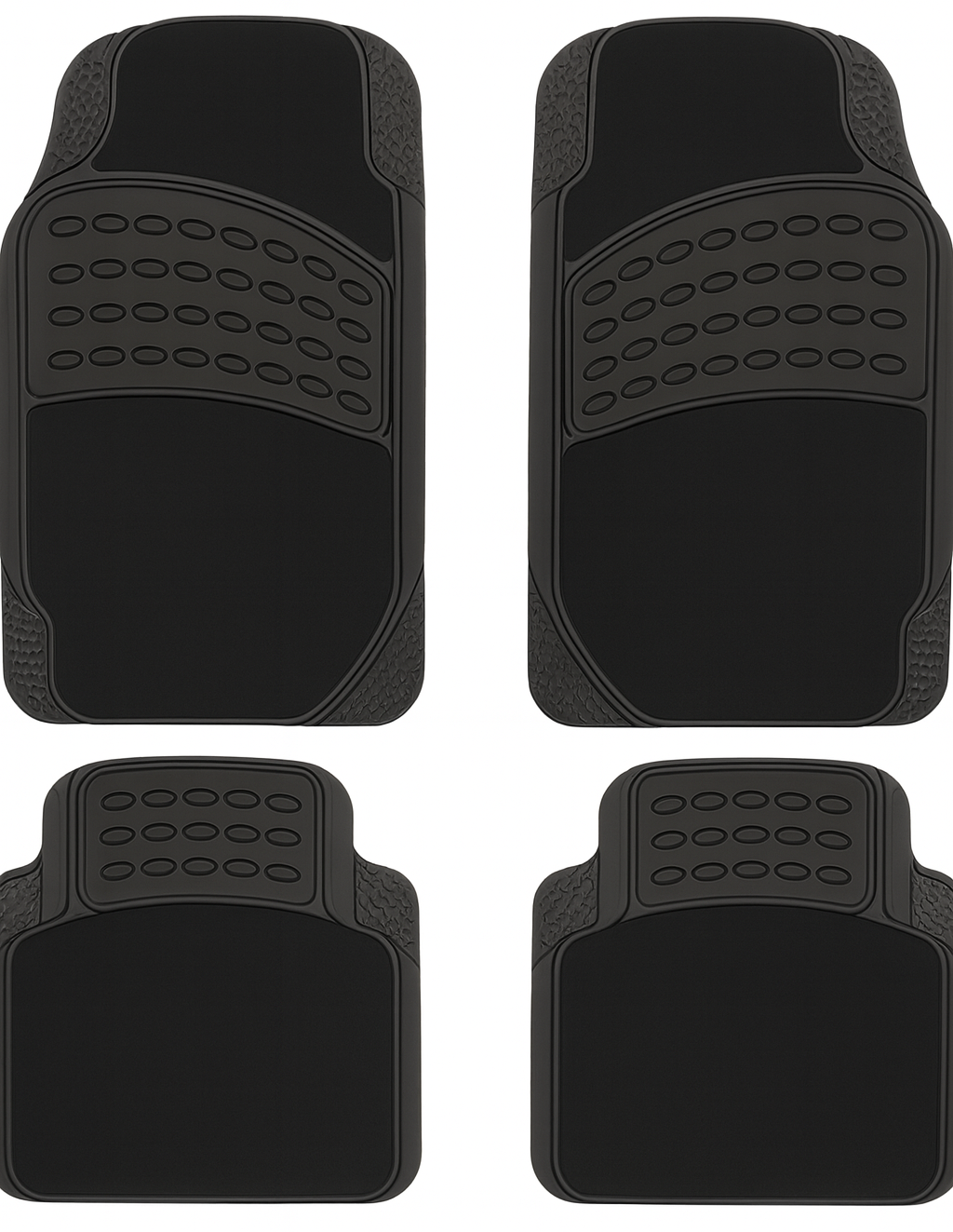 Высококачественный универсальный комплект из 4 автомобильных ковриков (2 передних + 2 задних), изготовленный из прочной резины и черной ткани. Обеспечивает отличную защиту от воды, грязи и пыли, сохраняя стильный вид и обеспечивая дополнительный комфорт благодаря ткани. Противоскользящая конструкция с усиленными зонами обеспечивает долговечность и простоту ухода.
